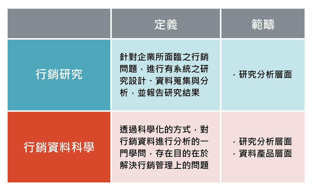 就定義上,行銷研究會產出研究分析結果,行銷人員可以根據這些結果,來協助做好行銷決策。就層次上來看,這是屬於研究分析的範疇。而行銷資料科學的範疇較為廣闊,因為行銷資料科學不僅僅能協助進行研究分析,還可以發展出不同的資料產品(Data Product)。資料產品是利用「資料」與「機器學習」所新生成的產品或服務。例如,之前我們曾經提過「資料變現」的概念,零售商可以將銷售時點系統(POS)、消費者忠誠度、庫存…等資料,出售給供應商,進而讓供應商強化庫存管理,進而減少「長鞭效應」;或是Gogoro的電動車不只是電動車,它還建構出龐大的「資料產品」體系。